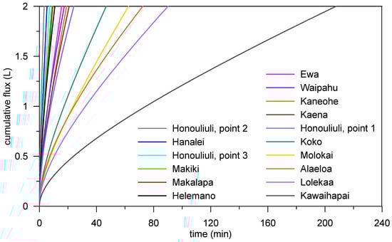 Cumulative flux through from a hypothetical infiltration trench for sixteen simulated soils.