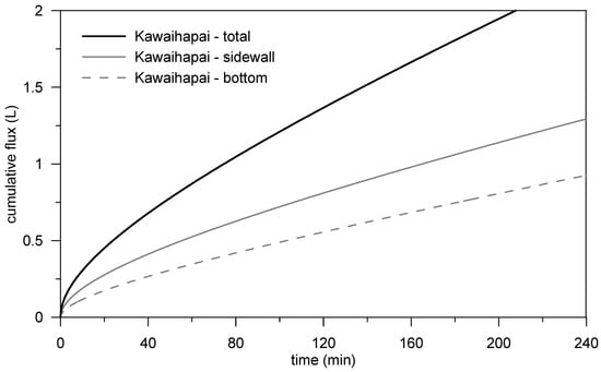 Table 5 is further supplemented by Figure 7, where total cumulative flux (bottom and sidewall contributions) through the infiltration trench for all simulated soils is shown. This figure shows the periods needed to empty the trench of given size (1 m by 1 m) and volume of 2 L. The bottom and sidewall contributions to total cumulative flux from such a hypothetical infiltration trench in Kawaihapai soil is depicted in Figure 8. The vertical sidewalls of the trench are shown to drain a larger volume of stormwater runoff than the bottom of the trench. However, this is due to the greater effective length of vertical sidewall compared with the trench bottom. Due to greater pressure head on the bottom considered in the simulations (h = 100 cm), unit length of the trench bottom showed larger contribution as compared with vertical sidewall.