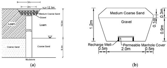 Diagram of the existing anti-filtration recharge well, (a) the existing anti-filtration recharge well profile, and (b) the recharge pool profile.