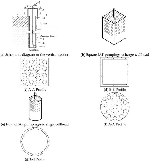 Two new types of IAF recharge-pumping wells have been designed with the aim of improving upon the deficiencies of the existing anti-filtration recharge well. One square IAF recharge-pumping well is a cube, the second round IAF recharge-pumping well is a cylinder, as shown in Figure 2. The applicable conditions of the IAF recharge-pumping wells are as follows: