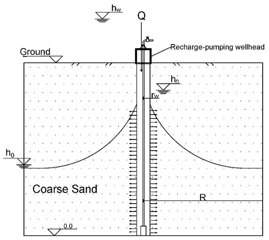 The steady-flow recharge model of the IAF recharge-pumping well consists of Equations (1)–(3). Equation (1) is the seepage equation of the IAF recharge-pumping wellhead. Equation (2) is the horizontal well-flow equation of a fully-penetrating recharge well in an unconfined aquifer. Equation (3) is the assumed relation between the water head after the water flows over the recharge-pumping wellhead (hf) and the effective recharge water head in the recharge well (hn).