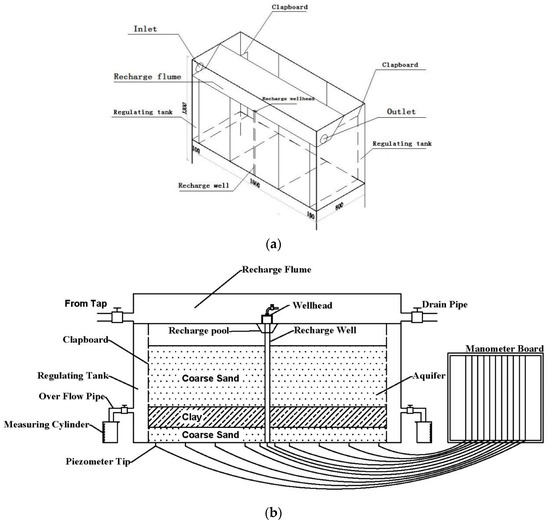 The sand tank mode is shown in Figure 4, the sand tank was a steel frame structure with transparent organic glass on each side, and allowed a direct observation of the loading and flowing state of the medium. The sand tank was 1.8 × 0.8 × 1.3 m (length × width × height), which was divided into three parts. The middle part was a 1.6 m medium-filled area and the other two part were the regulating tanks with a length of 0.1 m on both sides. There was a porous baffle plate between the medium-filled area and the regulating tank. In order to realize the constant water head, a valve was installed in the regulating tank to control its water level. Twenty piezometric tubes were arranged at the bottom of the medium-filling area to measure the water head of each part of the sand tank, during the recharge process, among them, No. 1–11 piezometric tube was symmetrically distributed along the recharge well, as shown in Figure 5. As a result of simulating a half-well test, the recharge wellhead model, the recharge well model, and the aquifer model were also made in half. Since the sand tank and the recharge well were both symmetrical in structure, a rectangular sand tank was used to simulate a semicircular aquifer. An organic glass pipe with a diameter of 20 mm and a length of about 1.0 m was divided into half, along the diameter, which was used to simulate a half recharge well and was closely-bonded and fixed to the middle of the front wall of the sand tank. Considering the actual proportional relationship between the recharge wellhead and the ordinary recharge well, the ratio of each recharge wellhead model was 1:25. The IAF recharge-pumping wellhead model had a height of 60 mm with an outer diameter of 40 mm. For comparative analysis, the recharge pool model was also made at a ratio of 1:25 and its bottom sizes and top sizes were 40 × 20 mm and 40 × 80 mm, respectively, as shown in Figure 6. The organic glass pipe used to simulate the recharge well, was used to open the hole and wrap the filter screen, which not only prevented the sand particles from entering the well, but also prevented the fine particles of the recharge water from entering the aquifer. The design’s open porosity was 20%. According to the aquifer conditions of the Luyangpu groundwater reservoir of the Pingtan Island, the stratum in the recharge test was divided into three layers and placed in the medium-filling area—the first layer was coarse sand (48 cm thickness), the second layer was clay (16 cm thickness), and the third layer was coarse sand (12 cm thickness), again. The sand sample used natural river sand, with an average particle size of 0.836 mm. The coefficient of uniformity was 3.20, and the coefficient of curvature was 1.18, which was classified as non-performing coarse sand. The dry density of the sand was controlled in the range of 1.44–1.50 g/cm3, and the hydraulic conductivity was 3.07–3.55 × 10−4 m/s. When the sand sample was filled, it was evenly scattered, loaded in layers, and compacted layer by layer. At the same time, the gas in the sand was gradually exhausted with water.