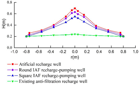 Four groups of the recharge tests of the fully-penetrating well in the unconfined aquifer were simulated. (1) The recharge test of the artificial recharge well; (2) the recharge test of the existing anti-filtration recharge well; (3) the recharge test of the round IAF recharge-pumping well; and (4) the recharge test of the square IAF recharge-pumping well.