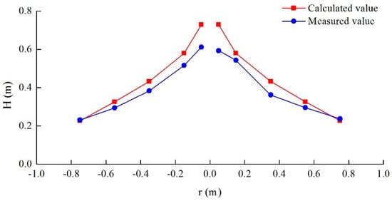 Taking the round IAF recharge-pumping well as an example, through the comparison and analysis of the groundwater level between the measured value (measured by piezometric tubes No. 1–11) and the calculated value of the theoretical equations (Equation (6)), the rationale of the theoretical equations of the single-well recharge quantity can be verified.