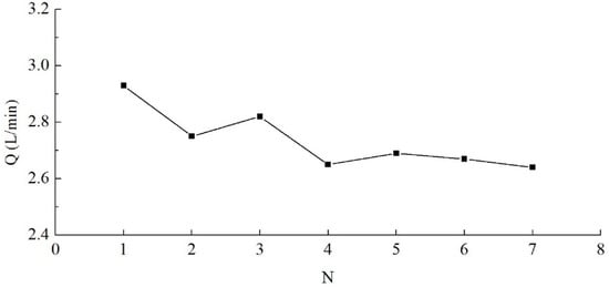 Taking the round IAF recharge-pumping well as an example. Under the same test conditions, a total of seven groups of recharge tests were carried out. Each group test was recharged for 5 min, and a total of seven sets of the single-well recharge quantity was measured. Figure 9 shows the relation curve between the single-well recharge quantity Q and the recharge test time N, in a successive recharge test.