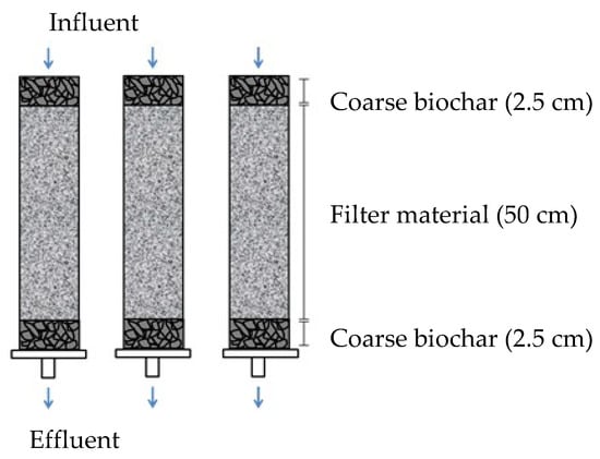 Pine-spruce biochar was obtained from Vindelkol AB (Umea, Sweden), willow biochar was obtained from a local farmer (anonymous), activated biochar was obtained from VWR (Stockholm, Sweden) and sand was obtained from Rimbojord (Sand & Grus AB Jehander; Stockholm, Sweden). Laboratory-scale biochar and sand column filters were packed in acrylic columns of 5 cm (diam.) × 55 cm (depth) (Figure 1) and operated under room temperature (20 ± 2 °C).