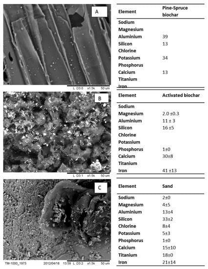 Scanning electron microscope image of the surface of (A) non-activated pine-spruce biochar, (B) activated biochar and (C) sand. Magnification factor ×1500. The values in the tables show percentage of the chemical composition of the surface (mean ± standard deviation, n = 3).
