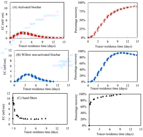Response curves of the filter materials to addition of a NaCl tracer pulse of 10 g L−1, measured as electric conductivity (EC) in the effluent from filters of (A) activated biochar (×; n = 2), (B) non-activated willow biochar (◆; n = 3) and (C) sand (▲; n = 2). Diagrams to the left show EC in effluent against time and diagrams to the right show percentage of tracer recovered against time. All filter materials had an effective particle size (d10) of 1.4–1.5 mm and a hydraulic loading rate of 32 L m−2 day−1.