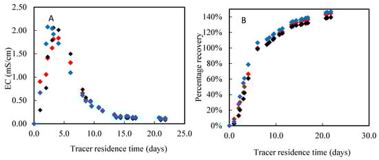 (A) Response curve and (B) recovery curve after the addition of a NaCl tracer pulse of 10 g L−1, measured as electric conductivity (EC) in the effluent from non-activated pine-spruce biochar filters with an effective particle size (d10) of 0.7 (red diamond), 1.4 (black diamond) and 2.8 mm (blue diamond). All filters had a hydraulic loading rate of 32 L m−2 day−1.