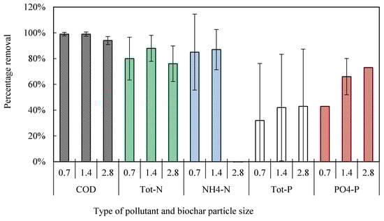 Performance of pine-spruce biochar filters with effective particle sizes (d10) of 0.7, 1.4 and 2.8 mm in the removal of wastewater pollutants at a hydraulic loading rate of 34 L m−2 day−1 and an organic loading rate of 20 ± 5 g BOD5 m−2 day−1. Bars indicate mean value (n = 3) and error bars represent standard deviation.