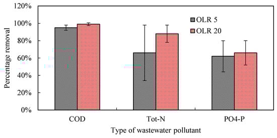 Removal of COD in the non-activated pine-spruce biochar was similar for OLRs of 5 ± 2 and 20 ± 5 g BOD5 m−2 day−1 (95 and 99%, respectively), with an effluent concentration of about 10 ± 3 mg COD L−1 in both cases (Figure 7). Despite the small difference in percentage removal of COD, the rate of removal at an OLR of 20 ± 5 g BOD5 m−2 day−1 was significantly higher. A possible explanation for this is that the higher organic load provided more substrate to the biofilm developing on the surface of the biochar. When the flux of organic matter to biofilm increases, the biological activity of the microorganisms is stimulated [31], and thereby also the mineralisation rate of organic matter [32]. It should also be noted that the biochar filters had a high capacity to buffer variations in loading conditions, as shown by their ability to maintain high COD removal rates with average fluctuations of 25% in the organic load. The performance of the biochar filters was also similar under the two HLRs tested (34 and 200 L m−2 d−1), with no significant effects or trends in percentage removal of COD.