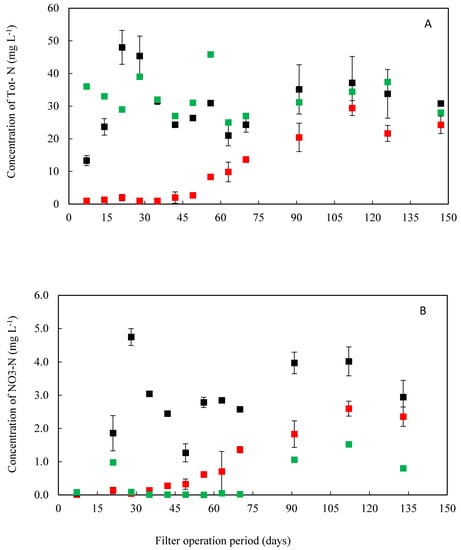 Concentration of total nitrogen (Tot-N) (A) and nitrate nitrogen (NO3-N) (B) in the influent (■) and in the effluent from non-activated pine-spruce biochar (■) and from sand (■), both with effective particle size (d10) = 1.4 mm. Filters were operated for 6 months at a hydraulic loading rate of 37 L m−2 day−1 and organic loading rate of 5 g BOD5 m−2 day−1. Symbols are mean values (n = 3). Error bars represent standard deviation.