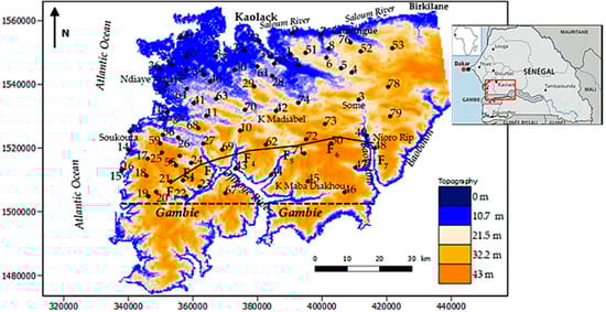 The study area is located in the mid-western part of Senegal (Figure 1) and extends over approximately 5000 km2 from 13°35′ to 14°10′ N, and from 15°40′ to16°30′ W. It is bounded to the west by the Atlantic Ocean, to the north by the Saloum River, to the south by the Gambia frontier and to the east by the meridian passing through Birkilane.