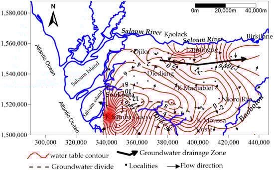 Unconsolidated sediments consist mainly of grains of unsorted fine quartz sand, with a 0.1 mm average diameter. In the east of the region (Nioro), quartz grains are coated by micritic (10–20 µm) calcite, which at depth develops to sparitic size (100 µm) [17] with trace quantity of glauconite and feldspar. Goethite and kaolinite are the two cements encountered respectively in ferruginous sandstones and sediments of sand and non-ferruginous sandstones. The most dominant clay mineral is kaolinite but there are also traces of illite, smectites and chlorite [17] within the study area, the thickness of the CT aquifer ranges from about 10 m to the north-west to 80–100 m eastward where buried palaeochannels have been identified by geophysical investigations [16]. The Eocene impervious marl, limestone and clay constitute the basement of the CT aquifer, with an elevation varying between −20 and −100 m [16]. The piezometric map (Figure 3) is illustrated based on head data of the field campaign in 2012. It is characterized by two main zones, a piezometric dome (hydraulic head > 20 m) located in the South West and a groundwater drainage zone with head below mean sea level (down to −12 m) in the North-East. This second zone collects part of the flow derived from the groundwater mound and flow from the Saloum River. In the southern part of the system, groundwater flow is divergent and discharges respectively to the Bandiala branch and to the Djikoye River. The hydraulic gradient is variable with mean values of 0.11% to South West. The gradient is very low towards the piezometric depression and varies between 0.02% and 0.05%. Transmissivity of the aquifer ranges between 3 × 10−4 and 3.5 × 10−2 m2/s. The horizontal hydraulic conductivity of the aquifer (K) spans 3 orders of magnitude (1.7 × 10−5 to 2.2 × 10−3 m/s), which shows a rather marked heterogeneity in the aquifer. The depth of the water table from the soil surface varies between 3 m to the west and 40 m to the east. Recharge was estimated using a chloride mass balance method in the unsaturated zone, and an average value of 17 mm/year represents the region as a whole [5,18]. Rainfall infiltration is the principal contribution for groundwater recharge.