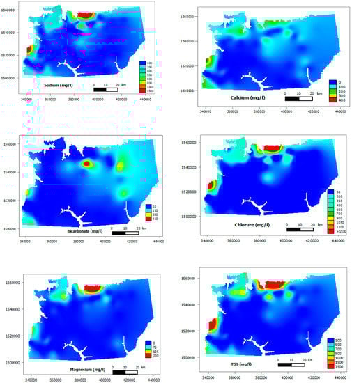 The spatial distribution map of the TDS, chloride, sodium, magnesium and calcium concentrations are very similar which demonstrates the origin of salinity (Figure 4). The abundance of cations in the groundwater is in the following order: Na+≥ Ca2+ ≥ Mg2+ > K+. The concentrations of cations in the groundwater ranges between 4.5–1726.0, 0.0–428.0, 0.0–228.0 and 0.0–128.0 mg/L for Na+, Ca2+, Mg2+, and K+, respectively. Chloride is the dominant anion, followed by bicarbonate and sulfate. The concentrations of the following anions Cl−, SO42− and HCO3− ranges between respectively 3.0–2886.0, 0.0–545.0 and 1.53–473.0 mg/L. Nitrate concentration in the study area varies in the range of 0.0–342.0 mg/L, and all samples fall below the desirable limits, except few samples. The main source of nitrate in the groundwater is attributed to anthropogenic local pollution. Drinking water with a high nitrate content can cause some diseases for children [32,33].