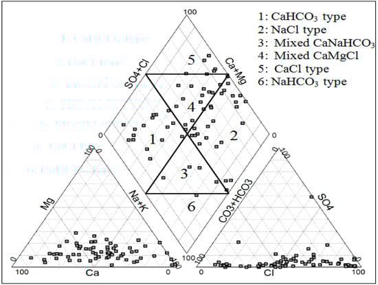 Concentrations of the main cations and anions are plotted on Piper diagram [34] for the analysis of the geochemical evolution of groundwater. Piper diagram has been widely used to study the similarities and differences in the composition of waters and to classify them into certain chemical types. Typical classification of hydrochemical facies for groundwater is shown in Figure 5. Two major facies types are dominant: the calcium bicarbonate (Ca-HCO3) water type and the sodium chloride (Na-Cl) water type. Some samples also represent mixed Ca-Mg-Cl, Ca-Na-HCO3 types and other samples demonstrate Ca-Cl types. It is suggested that the chemistry of the groundwater was controlled by a mixing process and cation exchange process as discussed below.