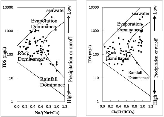 In addition to the Piper diagram, Gibbs plots are also used to gain better insight into hydrochemical processes such as precipitation, rock water interaction and evaporation on groundwater chemistry in the study area. Gibbs [20,35] demonstrated that if TDS is plotted against Na/(Na + Ca) and Cl/(Cl + HCO3), this would provide information on the mechanism controlling the chemistry of waters.
