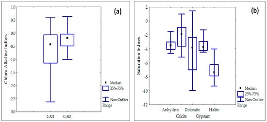 A positive SI value points out supersaturation and a tendency for the mineral to precipitate from the groundwater, whereas a negative SI indicates undersaturation and hence the dissolution of the minerals into groundwater. For a given mineral, there is apparent equilibrium into groundwater if SI values ranging between −0.5 and +0.5 and there is no dissolution and no precipitation for the mineral in these groundwater [54,55]. Wateq.dat is the thermodynamic database used [25,56]. The saturation indices of Anhydrite, Calcite, Dolomite and Halite are presented in Figure 7b. The calculated values range from −4.65 to −1.03, −5.19 to 0.98, −9.97 to 0.69 and −9.33 to −4.02 respectively. The Anhydrite, Gypsum and Halite SI indicate that groundwater is very undersaturated with these minerals. Groundwater is saturated with respect to carbonate minerals for few samples. About 10% of groundwater samples display saturation indices of calcite and dolomite, which range from −0.50 to 0.50, indicating equilibrium with respect to these minerals.