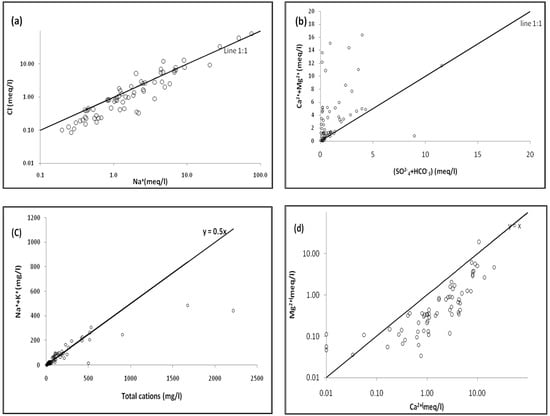 The analysis of the different hydrochemical processes responsible for the composition of the groundwater relies on the different relationships between the dissolved species and also on their content [45,46,47]. The relationships between concentrations of the major dissolved elements are shown in Figure 8. The plot Cl− vs. Na+ has been used to identify the sources of salinity in groundwater environment. Figure 8a shows the value of Cl− as a function of Na+ in the groundwater samples and there is a strong correlation (R = 0.99) between them.