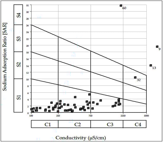 Sodium adsorption ratio (SAR) is also an important parameter for determining the suitability of groundwater for irrigation because it is a measure of alkali/sodium hazard to crops. Irrigation with water rich in Na+ can reduce soil permeability and thus limit the flow of air and water. This is due to the exchange processes that are established between water and soil. The Na+ ions are adsorbed by the clay particles replacing the Mg2+ and Ca2+ ions [62,63,64]. The excess sodium or limited calcium and magnesium are evaluated by the Sodium adsorption ratio SAR (Equation (5)) which is expressed as: