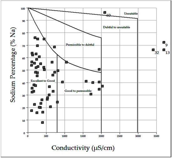 Samples (9), (13), (32), (60) are unsuitable for irrigation as shown by the US salinity and Wilcox diagrams used to estimate the quality of waters. For the first three samples, the unsuitable quality is due to their closeness to the Saloum river ((9), (32)) and to the sea (13) and thus to saline intrusion. The well (60) is located inland and its water quality cannot be associated with the current position of saline intrusion. This abnormal salinity water might be indicative of the presence of salt-water pockets of ancient valleys existing in this sector. The water in this well is not suitable for irrigation with its high content of bicarbonate (472.2 mg·L−1) responsible for precipitation of carbonaceous minerals and an increase in Sodium content. For a better understanding of the bicarbonate effects on the negative impact of Sodium, the RSC method must be coupled with the conclusions obtained from the study of salinity with the two diagrams (US salinity and Wilcox).