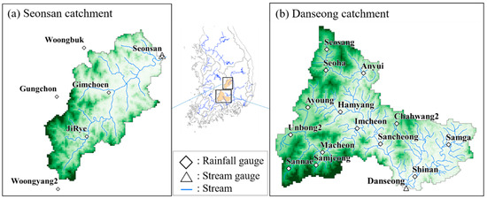 Maps of the study areas: (a) Seonsan catchment and (b) Danseong catchment in South Korea.