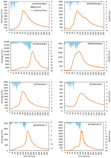 The rainfall data used in this study are eight rainfall events that occurred in Danseong and Seonsan catchments (Table 1). The average rainfall data for each catchment were generated by the Thiessen Polygon method, using the observed rainfall of the rainfall stations (Figure 1). The rainfall stations are operated by the Ministry of Land, Infrastructure and Transport (http://www.molit.go.kr). The time interval of the data was 10 min, and the precipitation amounts varied from 43 mm to 225 mm. The precipitation time distribution of the rainfall events, and resulting hydrographs, show substantial variation (Figure 2).