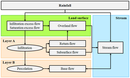 The GRM is an event based rainfall-runoff model. It simulates overland flow, channel flow, infiltration, subsurface flow, percolation, and baseflow (Figure 3). Runoff is calculated using the kinematic wave equation, and infiltration is calculated using the Green-Ampt model. The GRM can properly simulate short-term flood events using a short simulation time interval, such as a 10 min time interval (e.g., in References [17,18]). The governing equations of GRM are as follows.
