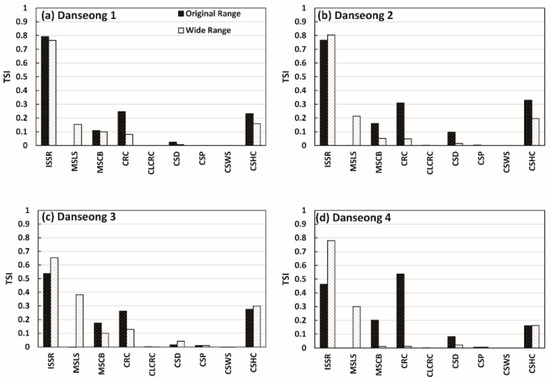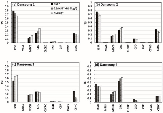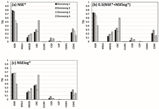 It is notable that Danseong 3 had a greater TSI of ISSR for initial soil saturation than Danseong 4, although the runoff volume of Danseong 3 was far greater than that of Danseong 4 (Figure 2). This phenomenon was observed with all objective functions, and the TSI of ISSR was higher using the low flow objective function (NSElog*) than when using that for high flow (NSE*). This suggests that the initial soil saturation is particularly important when calculating low flow during large rainfall events with very high runoff. In NSE*, Danseong 3 had a greater TSI of CSHC for soil water movement than Danseong 4, which indicates that this parameter plays an important role in high flow calculations of large rainfall events with very high runoff. As for MSCB and CRC, Danseong 3 had smaller TSI values than Danseong 4. This is probably because total runoff simulations consider the interaction between ISSR, MSCB, and CRC. For example, the TSI of river runoff-related MSCB and CRC decreases when the TSI of ISSR related to initial soil saturation increases.