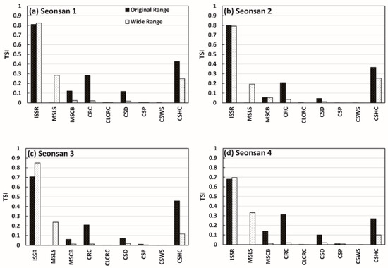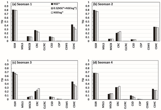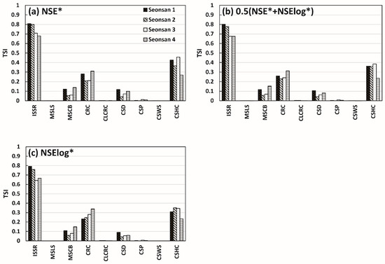 Figure 4 and Figure 5 show parameter TSI values for four rainfall events in Danseong and Seonsan catchments for the three objective functions. Parameter sensitivity varied depending on the scale of rainfall events, even in the same catchment. The rainfall events of Danseong catchment showed greater parameter sensitivity differences than those of Seonsan catchment. Considering the fact that the precipitation amount during events was similar in both catchments (Table 1), the parameter sensitivity was likely affected by the runoff difference caused by different catchment characteristics (see Section 2).