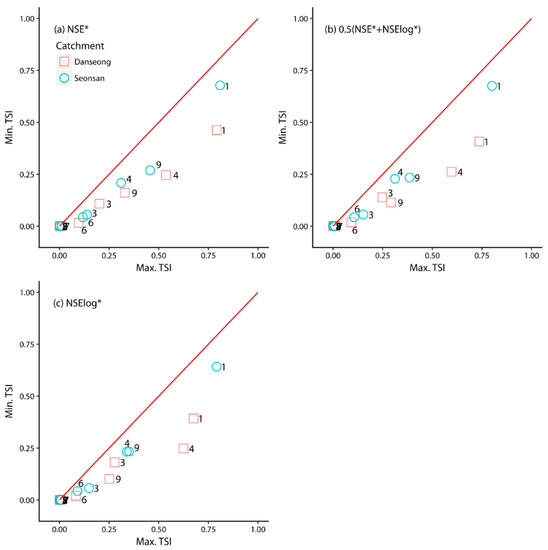 where Qobs,i is the observed flow with time interval i (10 min in this study), is the mean value of observed flow, Qsim,i is the simulated flow, and n is the number of time steps. NSE ranges from −∞ to 1, where 1 indicates a perfect match between observed flow and simulated flow. NSE squares the difference between observed flow and simulation flow values; thus, a relatively greater weight is given to high flow fitting on the hydrograph [54,55,56]. However, the TSI value can turn into a bias due to a large negative NSE value, because NSE values range from −∞ to 1. For this reason, we employed NSE* [57], modified from NSE. The NSE* objective function is expressed as: