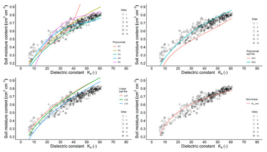 3.3. General and Site-Specific Relationships between Dielectric Constant and Soil Moisture Content