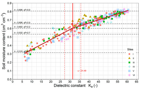 The break-point (Ψ) for the analyzed dataset was determined for Ka equal to 31.49 (Figure 3). The 95% confidence interval for this parameter was wide and ranged from 27.22 to 35.76 (Figure 3). Residuals from the model (Equations (5) and (6), or (5) and (7)) were normally distributed around the average which was confirmed by the Shapiro–Wilk testing statistic (W = 0.9919) and the p-value (0.1302). The RMSE value for the GBLM equations equals to 0.0405 cm3 cm−3 and is essentially lower than the estimates determined for the equations indicated in Table 4. This type of broken-line relationship is often used to assess the threshold value where the effect of the covariate changes. In the fields of hydrology and soil hydrology, the piecewise linear regressions (PLR) and the determined threshold values are used to explain the influence of the vegetation cover fraction on the reduction of runoff [84] and the erodibility coefficient [85]. In the water study, the two-segmented broken-line equation is applied for predicting water electrical conductivity using a portable X-ray fluorescence meter [86]. The meaning of a break-point in this study of the TDR calibration curve can be explained as the point depending on the soil water retention characteristic (horizontal lines on Figure 4). The threshold value (Ψ) with the confidence interval in general was included between horizontal lines which indicated the moisture contents at matric potential between pF values from 2.0 to 2.7. The average moisture content at break point (θψ = 0.6044 cm3 cm−3) was approximately equal to soil moisture content at pF = 2.2 (θv = 0.6020 cm3 cm−3). The validity of the threshold value can be explained by bulk density changes (Figure 4).