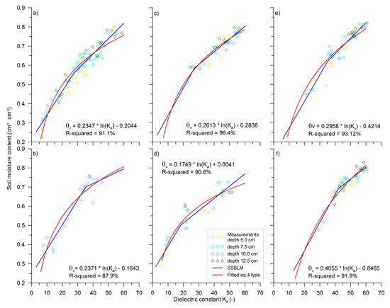 Figure 5 shows the measured data of the soil moisture content and the dielectric constant for the specific sites and their fitting using the segmented model (SSBLM) and the logarithmic equations (NL type).
