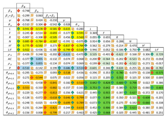 Correlation graph of the analyzed variables. Arrows in green and red indicate statistically significant positive and negative correlations. Dark yellow arrows indicate not statistically significant correlations. The labelled cells indicate statistically significant correlation between different types of variables regarding the state of the habitats, SSBLM and soil hydro-physical properties.