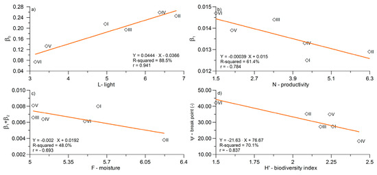 Figure 7a–d shows simple regression lines allowing prediction of the broken-line model parameters (Equations (1) and (3)) using bioindices (L, F, N, H’) determined on the basis of the measured plant species’ composition for the selected sites.