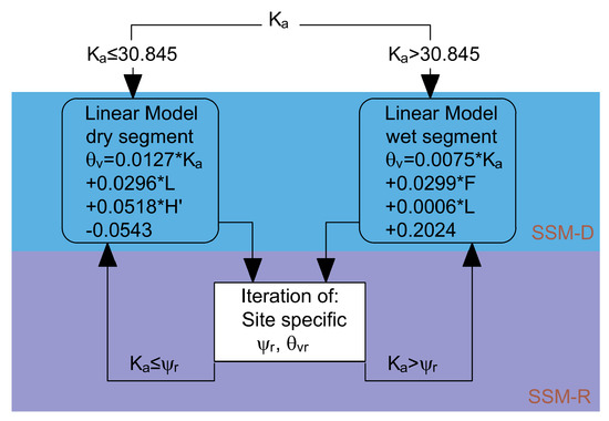 Table 6 summarizes the cross-validation scheme. In total we trained six models SSM-D1, …, SSM-D6. The results of the model selection approach indicate that, depending on training dataset, the SSM-D models included different explanatory variables for soil moisture prediction. The performance of the cross-validation split models is described by RMSEtrain. The main independent variable in each training model, which binary split our dataset into two child sets, was dielectric constant (Ka). In the second stage of the cross-validation scheme we reduced the number of variables to the commonly appearing covariates in the training model stage. For this reason, different sets of explanatory variables were tested. Finally, we found the appropriate combination of the variables i.e., Ka, F, L and H’ (SM—set of model) in the model for which at each split of the data the RMSEcv values were close to the RMSEtrain (Table 6). Additionally, in Table 6 the RMSEcv values determined in cross-validation procedure performed for the GBLM model are also included. A last SSM-D model fitting was conducted using the mentioned combination of variables (SM) as single fit to all data. Fortunately, the resulted SSM-D model includes two nodes for which the linear regression models have been established (Figure 8).