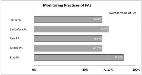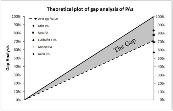 Given that environmental sustainability and ensuring human well-being in the Mediterranean area strongly depend on sustainable water resources management and valuable NPs preservation [], the elaboration of coherent cost-effective measures across all Mediterranean water bodies is required. This should be based on comprehensive monitoring analysis, on the assessment of the anthropogenic pressures, and on the ability to make reliable prognosis. In this context, effective management actions can derive from proper monitoring practices and pressure assessment methods. One example could be gap analysis, used as a tool to assist the quantification between present and desired level in important PAs’ governance major topics.