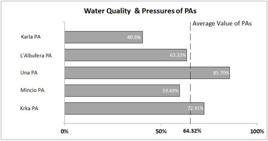 The average gap was calculated in order to visualize the results (Figure 5). In general, the part of “Management Practices” received better rating, followed by knowledge availability in order to produce indices related to “Water Quality and Pressures”. Furthermore, the results showed a possible vulnerability of surface water bodies of the PAs in connection with the human activities-pressures found in these areas.