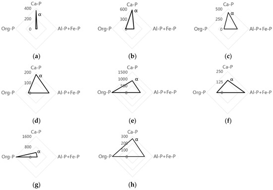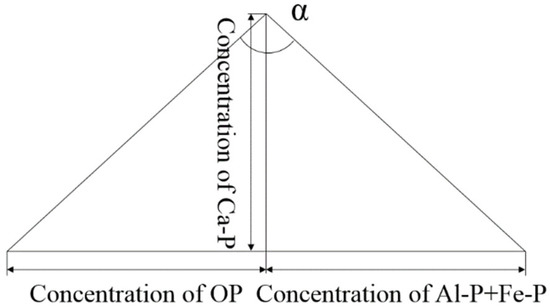 It is generally recognized that OP, Al-P, and Fe-P are closely related to the nutrient status of the overlying water and eco-health of the sediments [22,23]. We need to judge these by comparison with other studies. There is not one simple and effective indicator that can be generalized across all studies. A “specific triangle” was drawn according to the concentrations of the certain forms of P in surface sediments, and “α” was calculated as the indicator by which we can judge the nutrient status of the overlying water and the eco-health of the sediments. The drawing method of the “specific triangle of P” is shown in Figure 2, and “α” could be gained by the equation below (“C” means concentration):