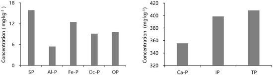 For each sample, the concentration of SP, Al-P, Fe-P, Ca-P, Oc-P, and OP was analyzed and determined, and the sum of the concentration of each form of P was considered as the TP concentration. All test results were averaged, as shown in Figure 3. The results indicated that the concentrations were ranked as follows: Ca-P (355.6 ± 86.0 mg/kg) > SP (15.9 ± 10.0 mg/kg) > Fe-P (12.4 ± 12.3 mg/kg) > OP (9.6 ± 6.1 mg/kg) > Oc-P (9.2 ± 3.8 mg/kg) > Al-P (5.4 ± 2.3 mg/kg). The IP concentration was 398.6 ± 83.6 mg/kg, and the TP concentration of each sample was between 194.0 and 540.7 mg/kg, with an average of 408.2 mg/kg.
