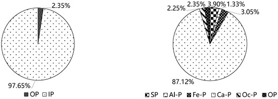 Figure 4 shows the ratios of IP and OP to TP. From the proportion of TP, IP accounts for 97.65% of the TP, while OP accounts for only 2.35%, the IP concentration is much larger than that of OP. It also shows the ratios of the different forms of P to the TP. The concentration of Ca-P accounts for 87.12% of the TP concentration, followed by SP (3.90%), Fe-P (3.05%), and Oc-P (2.25%). Finally, Al-P accounts for the smallest TP concentration—only 1.33%. The Ca-P concentration has an absolute advantage, and its concentration is far greater than that of other P forms.
