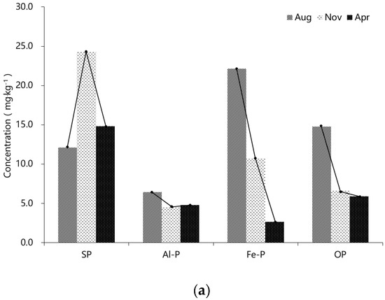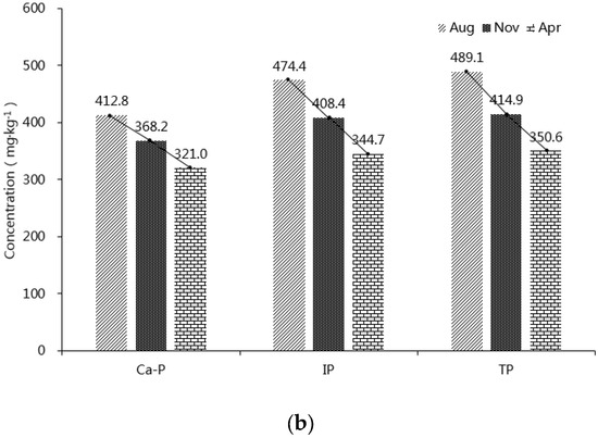 Figure 5a,b show the changes in SP, Al-P, Fe-P, OP, Ca-P, and TP in the surface sediments of the YLZB River. The sampling time of this research was August 2016, November 2016, and April 2017, which represent the wet season, the normal season, and the dry season of the YLZB River, respectively. In August 2016, the SP concentration in the surface sediments of the YLZB River basin was 12.1 mg/kg, while the SP concentrations in November 2016 and April 2017 were 24.3 mg/kg and 14.8 mg/kg, respectively. The concentration in August 2016 was at a relatively low level. The concentrations of Al-P, Fe-P, Ca-P, and TP were higher in August than in November or April. Except for SP, other forms of P and TP all have their highest concentration in August.