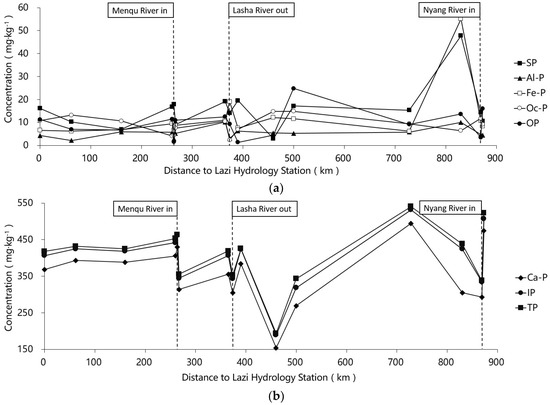 The changes of TP and different forms of P in the surface sediments of the YLZB River basin are shown in Figure 6a,b. In the figure, the positions where the three tributaries flow out from the mainstream or into the mainstream are marked, and the concentrations of the different forms of P and TP are the results obtained from the samples which were collected from each tributary sampling site. TP concentration varies from 194.0 to 540.7 mg/kg, the site which possesses the lowest TP concentration is located at the widest part of the YLZB River, and the site which possesses the highest TP concentration is near Langxian County. In the middle reaches of the YLZB River, TP concentrations remained basically unchanged in the upper part of the river. Additionally, the values of several adjacent sections were very similar. In the middle part of the research area, TP concentrations increased in the three sampling sites of the mainstream, the site of the Renbu Bridge, the site of the Qushui County Bridge, and the downstream site of the Lhasa River outlet. TP concentrations in the adjacent sections showed a dramatic change, ranging from 100 mg/kg to 200 mg/kg. The two sites with the highest TP concentration were also determined, with the values of 540.7 mg/kg at the Langxian County site and 522.7 mg/kg at the Nuxia Hydrological Station site. There is no increasing enrichment or diminishing dilution of the TP concentration below the Lazi Hydrological Station site, but there was a great difference in the TP concentration at the adjacent sites. The degree gradually increased from the upper part of the middle reaches to the lower part of the middle reaches. The difference in the TP concentrations between the adjacent sections in the upper part of the river is only 30 mg/kg, and the difference in the TP concentration between adjacent sections in the lower part of the middle reaches is relatively large, even up to 200 mg/kg. The TP concentration has a good correlation with the IP concentration (correlation coefficient = 0.997) and the Ca-P concentration (correlation coefficient = 0.955), as is shown in Table 1. Thus, the trend along the path is similar. The concentrations of SP, Al-P, Fe-P, Ca-P, Oc-P, and OP were low, and the trend was not obvious. Furthermore, there was no obvious correlation with the trend of TP.