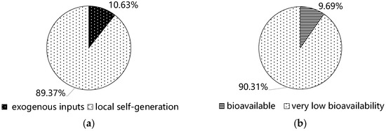 On the other hand, SP, Al-P, and Fe-P are considered to be bioavailable P and are easily released into the overlying water for bio-utilization. Sixty percent of the OP also can release into the overlying water [24]. Figure 7b shows the ratio of P concentrations with different bioavailability to the amount of TP. It can be seen from the figure that the concentration of bioavailable P in the surface sediments of the YLZB River basin is low, regardless of the ratio of TP (9.69%) or the absolute concentration (39.6 mg/kg).