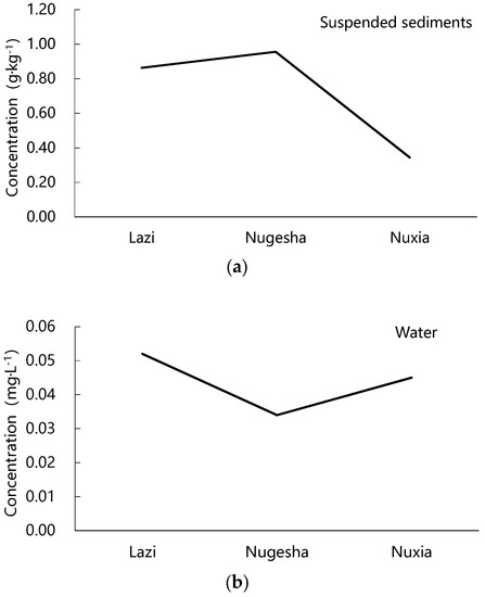 In addition to the distribution of P in sediments, the transportation of P in rivers is also a concern [25,26]. Figure 8a,b show the TP concentration in the suspended sediments and the dissolved phosphorus concentration in the water measured at the Lazi Hydrological Station, the Nugesha Hydrological Station, and the Nuxia Hydrological Station in August 2016. The results show that there is no positive correlation between the TP concentration of the suspended sediments and the dissolved phosphorus concentration of the water. The TP concentration of the suspended sediments at the Nugesha Hydrological Station site is the largest compared to the other two sites, while the dissolved phosphorus concentration in the water is the lowest.