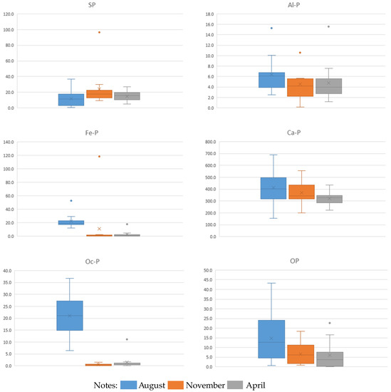 The concentration of SP is lowest in August. For other forms of P, such as Al-P, Fe-P, OP, Ca-P, and TP, the concentration is highest in August. Further evidence for that conclusion can be obtained by examining the position of the median in the boxplot of the entire dataset. Although the statistical analysis of the dataset shows that, except Ca-P, the concentration of other forms of P is fairly discrete. It does not affect the conclusion even if there are several individual points far from the average value. The position of every median of different forms of P clearly indicate their relative magnitude, as is shown in Figure 10 below.