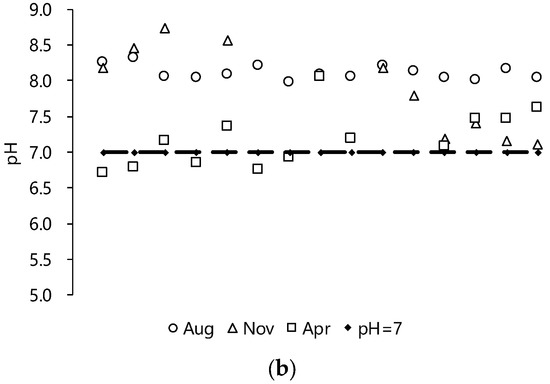 Figure 11b shows that, in August 2016, the pH value of each sampling site in the water body was between 7.98 and 8.31. In November 2016, the pH value of each sampling site was between 7.11 and 9.20, which indicated weak alkalinity. In April 2017, the pH of each sampling site in the water body was between 6.71 and 8.06; overall, the sites were close to neutral, although some sites were weakly alkaline, and some were weakly acidic. According to previous research, a high pH promotes the release of NaOH-P, and a low pH promotes the release of HCl-P [15]. Under neutral conditions, the release of P is the lowest in the sediments [16,17]. Similarly, in this study, Fe-P was extracted under alkaline conditions, SP and Al-P were extracted under neutral conditions, and Ca-P was extracted under acidic conditions. The average value of each site (355.6 mg/kg) is much larger than the average value of Fe-P, SP, and Al-P at each site (12.4, 15.9, and 5.4 mg/kg, respectively). If the overlying water presents weak alkalinity and neutral conditions, the Ca-P, which is a dominant portion of the P concentration in the research area, is difficult to release. Moreover, the Fe-P, SP, and Al-P are relatively easily released, but their concentrations are relatively low. If the overlying water body is weakly acidic, Ca-P may be released. It can be seen from the figure that, in April 2017, some of the upper sites in the research area were weakly acidic, and the TP concentration in the water body was higher than that in August 2016. It can be inferred that the P desorption from sediments during the dry season is greater than the adsorption. However, because the overlying water body is weakly acidic, the number of sections is small and only appears in the dry season. Therefore, in the case of the YLZB River, P in the sediments will not be released in large quantities if the overall pH value does not drastically change.