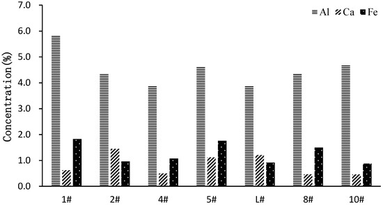 The sediments can not only be the “source” and release P to overlying water, but also could be the “sink” and adsorb P from overlying water. Some samples were chosen and their concentrations of Ca, Al, and Fe were tested, as is shown in Figure 12. Previous research indicated that Al and Fe oxides show a very strong affinity to P [34]. In this area, the concentration of Ca is lower than that of Al and Fe. Aluminum oxides and iron oxides may exist in large amounts. Extraneous P from human activities will bound aluminum oxides and iron oxides, making sediments become the “sink” of P.