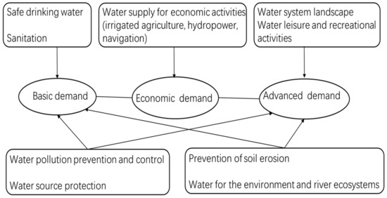In practice, the contents of water goods and services are rich and diverse for the characteristic of water, which are classified as basic demand, economic demand and advanced demand in this study. Meeting basic water demands is always underlined as the main priority [24], and basic demand is concerned with provision of essential services, such as safe drinking water, sanitation, and prevention of soil erosion [25]. Economic demand supports economic growth through water infrastructure, irrigated agriculture, industrial development, hydropower, and navigation [26]; advanced demands include river landscaping, recreational activities, and prevention of soil erosion. These three types of demand correspond to different levels of socioeconomic development (Figure 1). The listed aspects in the three rectangles on the top are concerned with the relation between water resources management and socioeconomic development. The issues listed in the two rectangles at the bottom are about the relationship between water resources management and ecological environment and restoration, including water pollution prevention and control, water source protection, and prevention of soil erosion. These are directly related to basic demand and advanced demand.